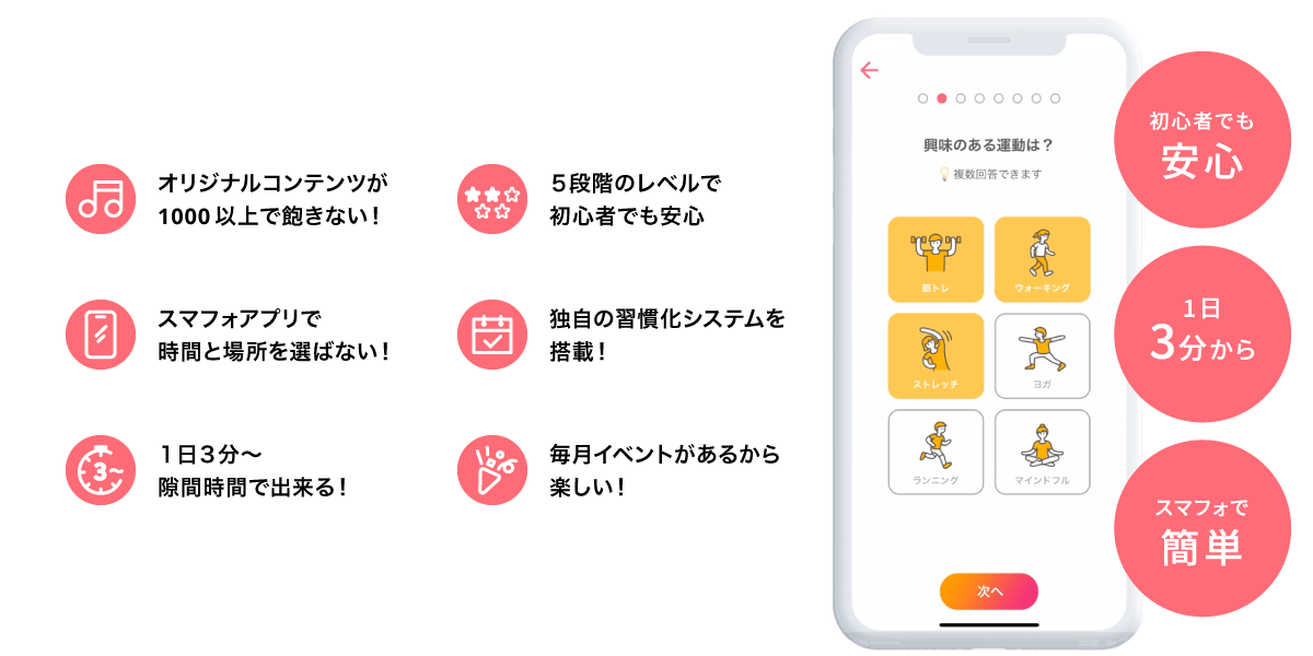 Beatfitは、従業員の皆様が運動・ストレスケアを「実践」していただくことにフォーカスしたサービスです。