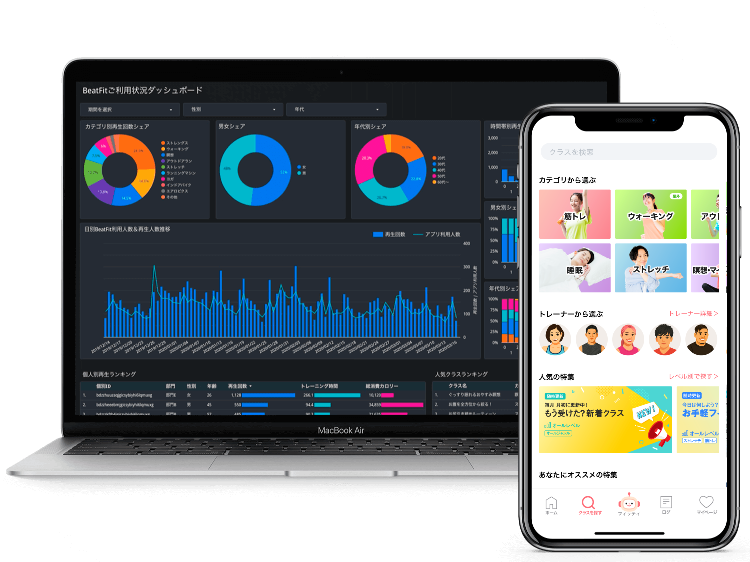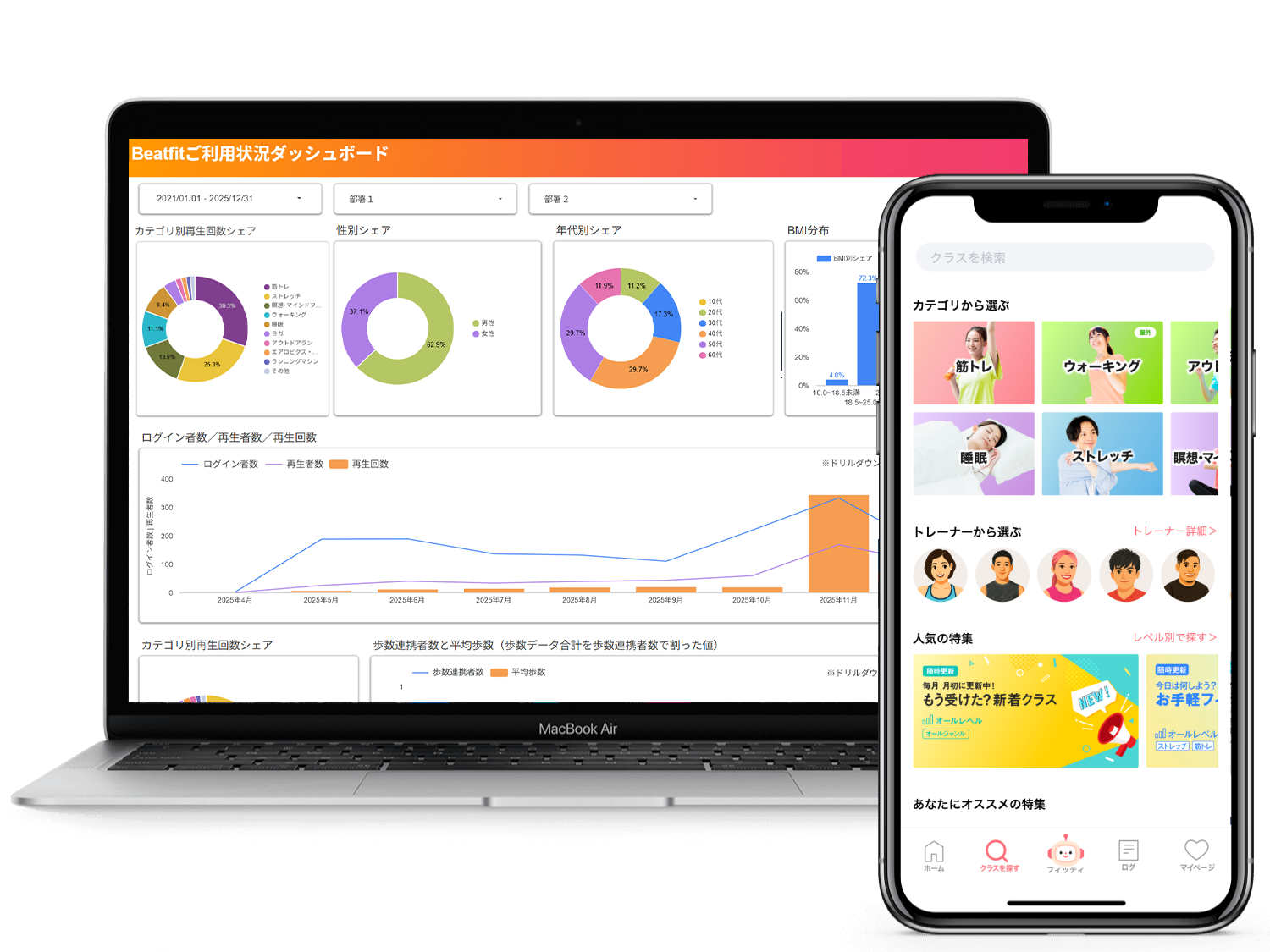 従業員の運動習慣率向上、メンタルヘルス対策を目的に、Beatfit Appを活用した健康経営ソリューションです。会社や部門ご都でのチーム競争、ダッシュボードの開放やデータ分析のサポートなど、企業に応じてカスタマイズしてご提案いたします。下記ボタンから詳細ページをご覧ください。